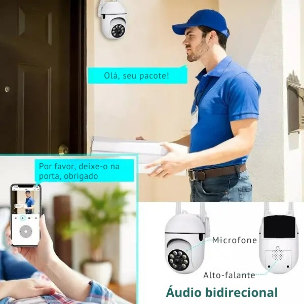 Com o microfone responsivo integrado na câmara de segurança exterior, pode ouvir e falar através da nossa aplicação.  O áudio bidirecional permite-lhe comunicar com os seus convidados, enquanto que o alarme de deteção de movimentos o ajuda a livrar-se rapidamente de visitantes ou animais indesejados.