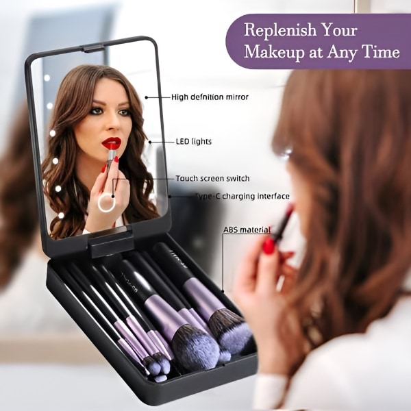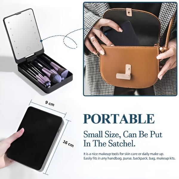 💡 Espelho LED incorporado na caixa compacta para retoques em movimento.